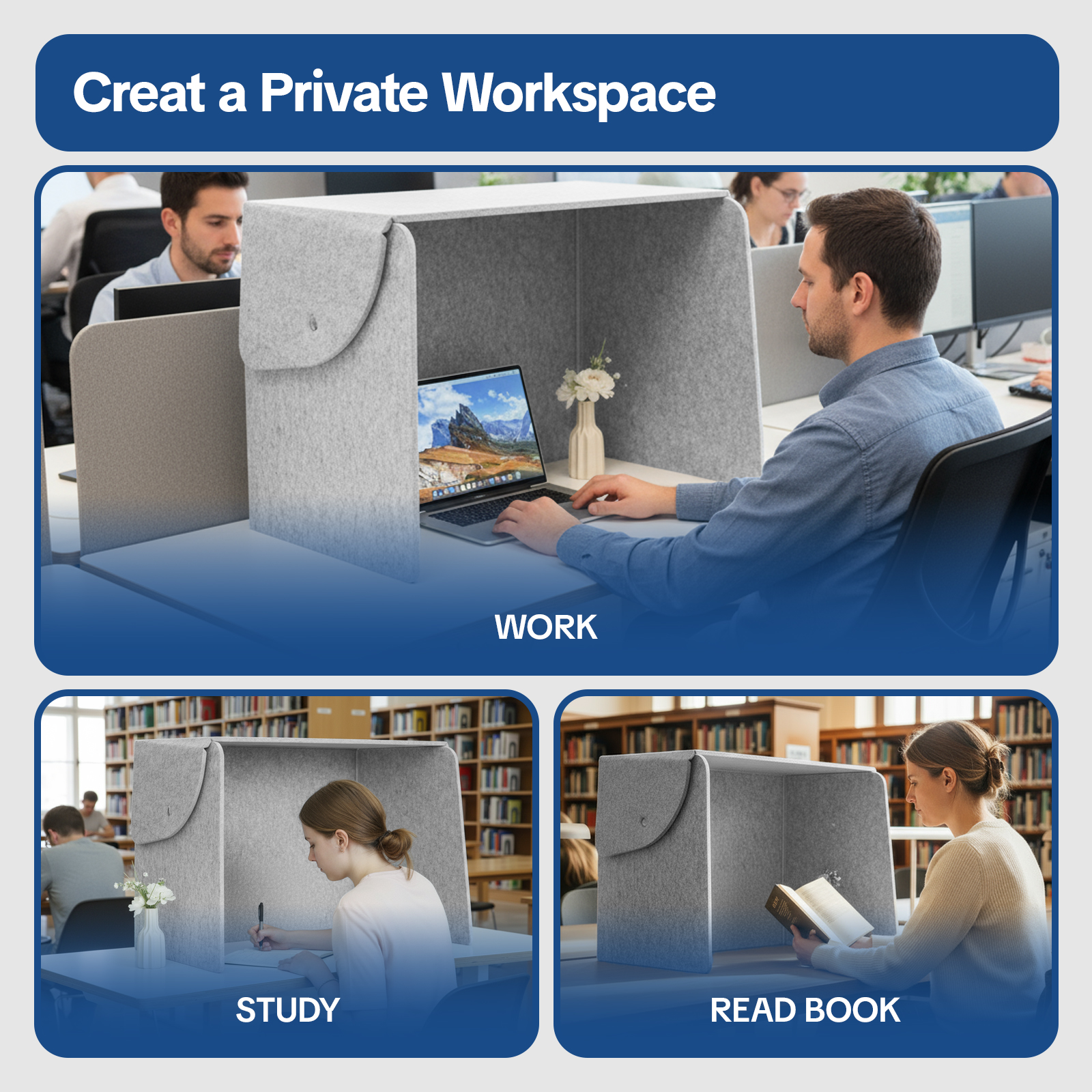 Whether used in open-plan offices, co-working spaces, libraries, or home offices, this divider effectively shields users from visual and auditory distractions, promoting productivity and concentration in various settings.