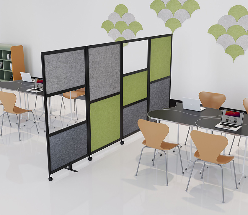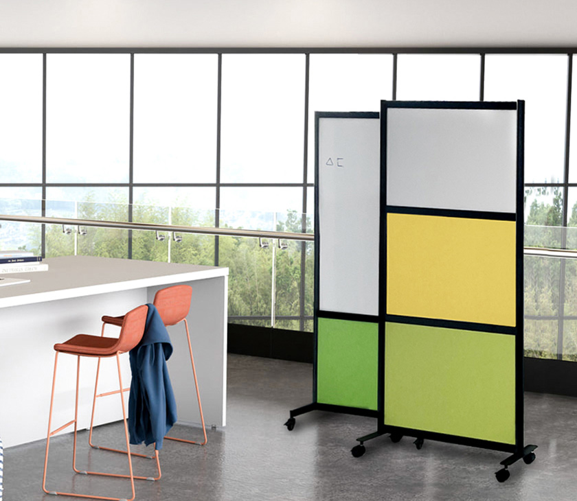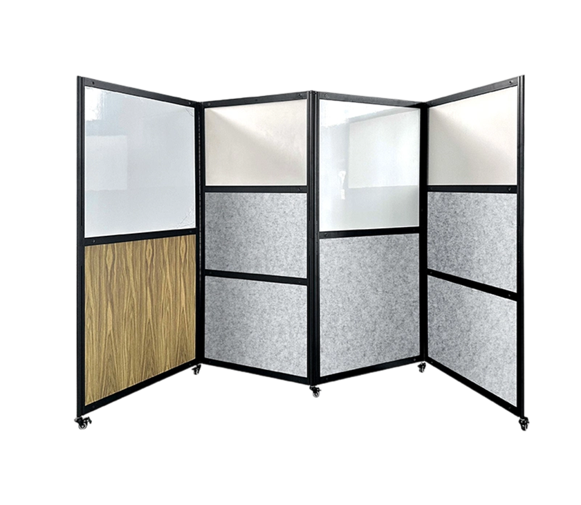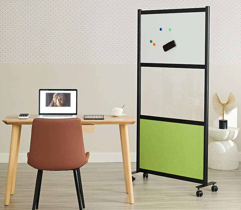 Our whiteboard is constructed from polyester fiber acoustic panels, whiteboard, and acrylic. It can function effectively as a movable writable partition. The combination of wood-grain printed acoustic panel and acrylic creates a more aesthetically pleasing appearance, making it a great fit for brainstorming conference rooms or home settings.